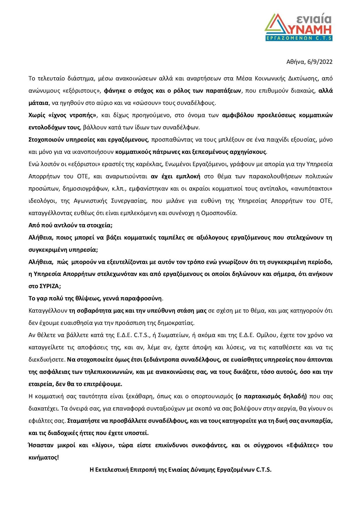 Ανακοίνωση Ενιαίας Δύναμης Εργαζομένων C.T.S. 06-9-2022