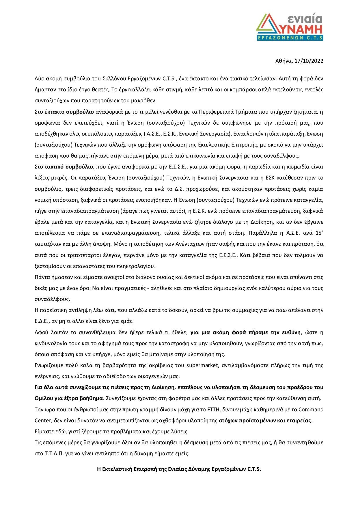 Ανακοίνωση Ενιαίας Δύναμης Εργαζομένων C.T.S. 17-10-2022