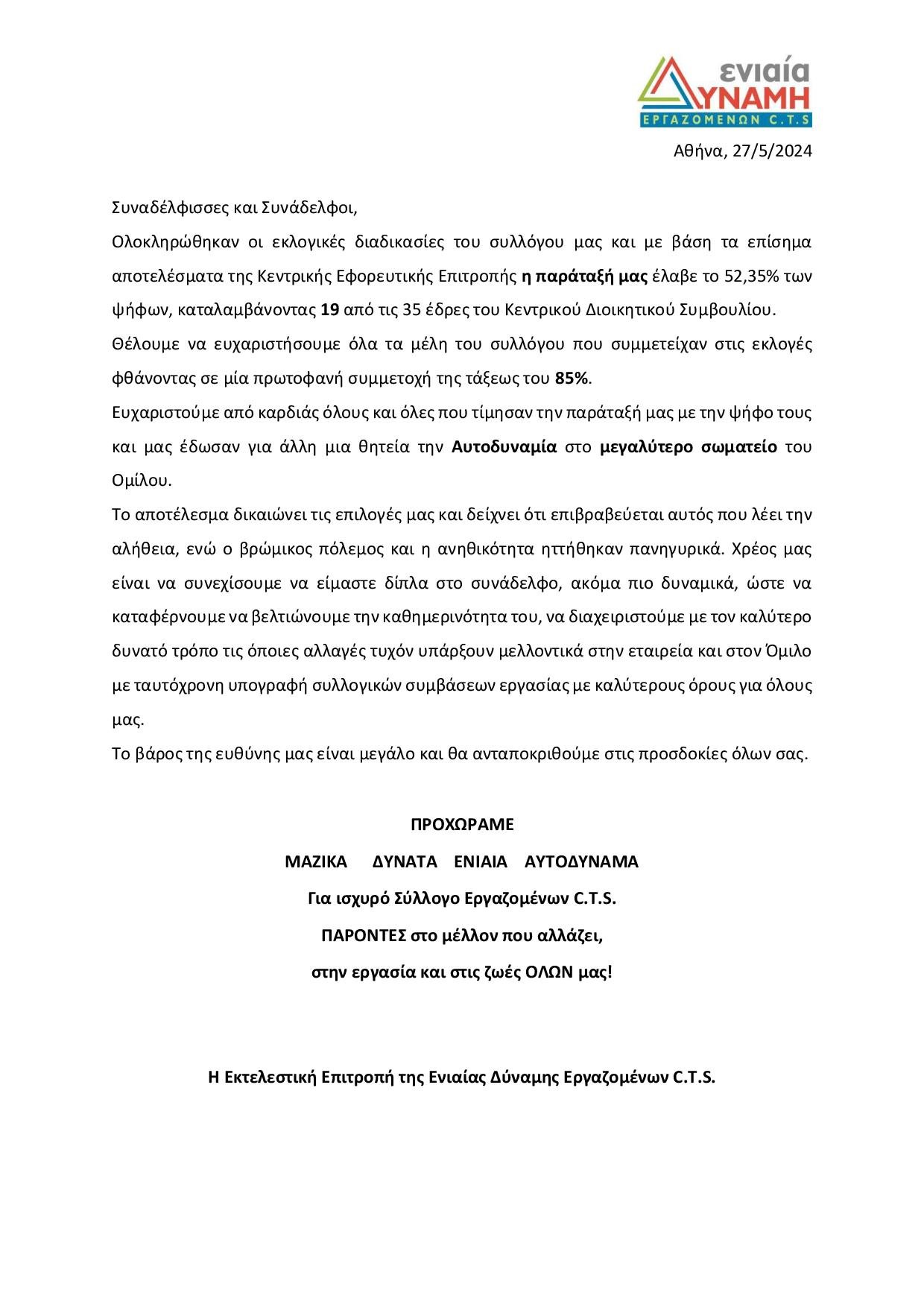 Ανακοίνωση Ενιαίας Δύναμης Εργαζομένων C.T.S. 27-05-2024